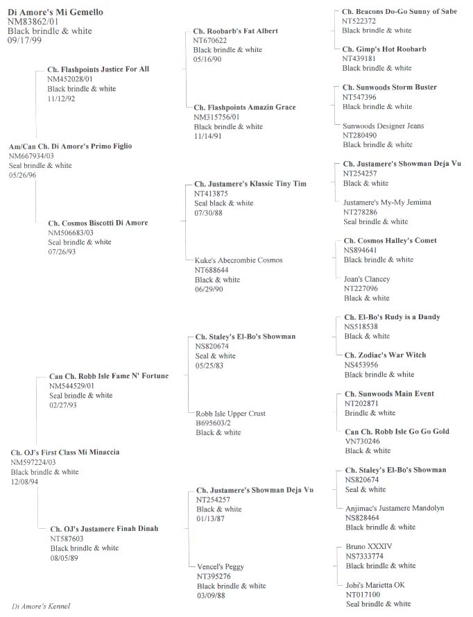 * Primo, "Junior" has a call name from his dad, but his AKC name is all about mom! Junior is truly his mother's "twin"! Dad is Am/Can. Ch. Di Amore's Primo Figlio, CGC and mom is Ch. OJ's First Class Mi Minaccia, CGC . Our first truly in-house breeding has produced a truly unique bundle of joy!